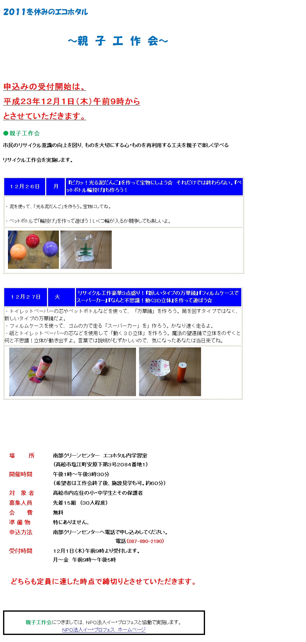 そこで、平成22年同様、南部クリーンセンター・リサイクル教室のバリューアップを図るプロジェクトを実施します。